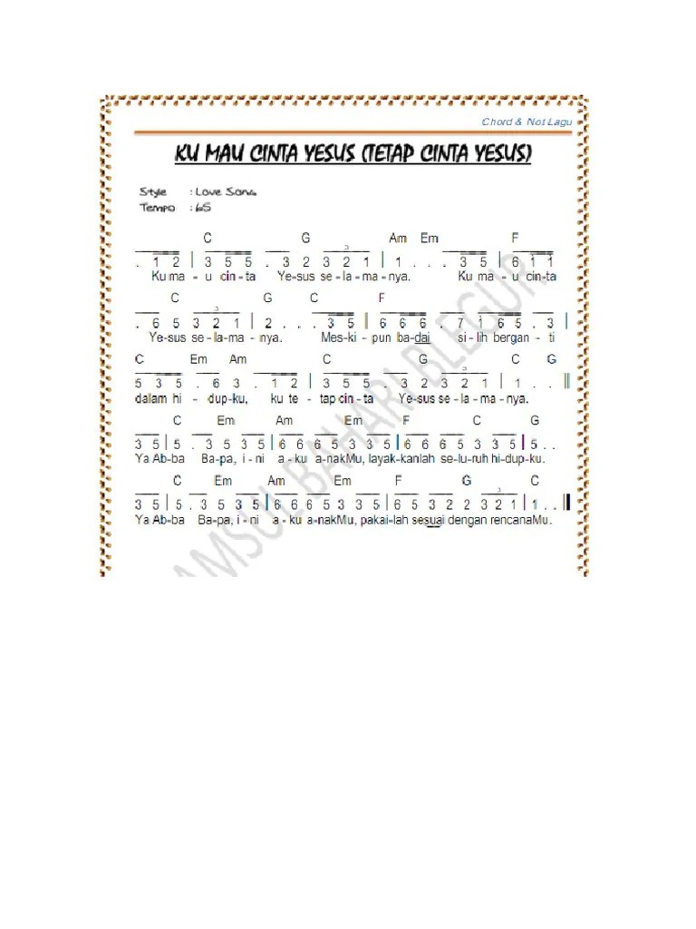 Ruri (vokal), hexa (gitar), lafi (bass), tyar. Do=c c g/b am c/g ku mau cinta yesus selamanya f c/e g ku . Ku tetap cinta ku tetap setia (grezia epiphania). D tak perlu kata maaf e a dan air . Chord gitar ku tetap cinta ku tetap setia.
